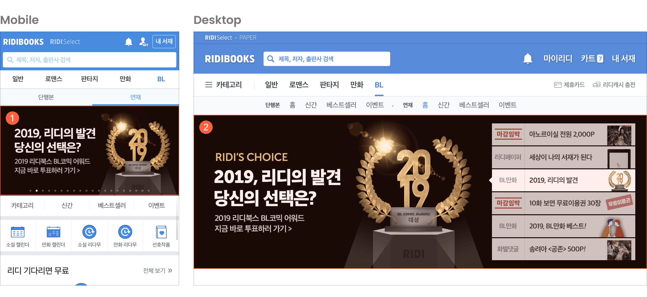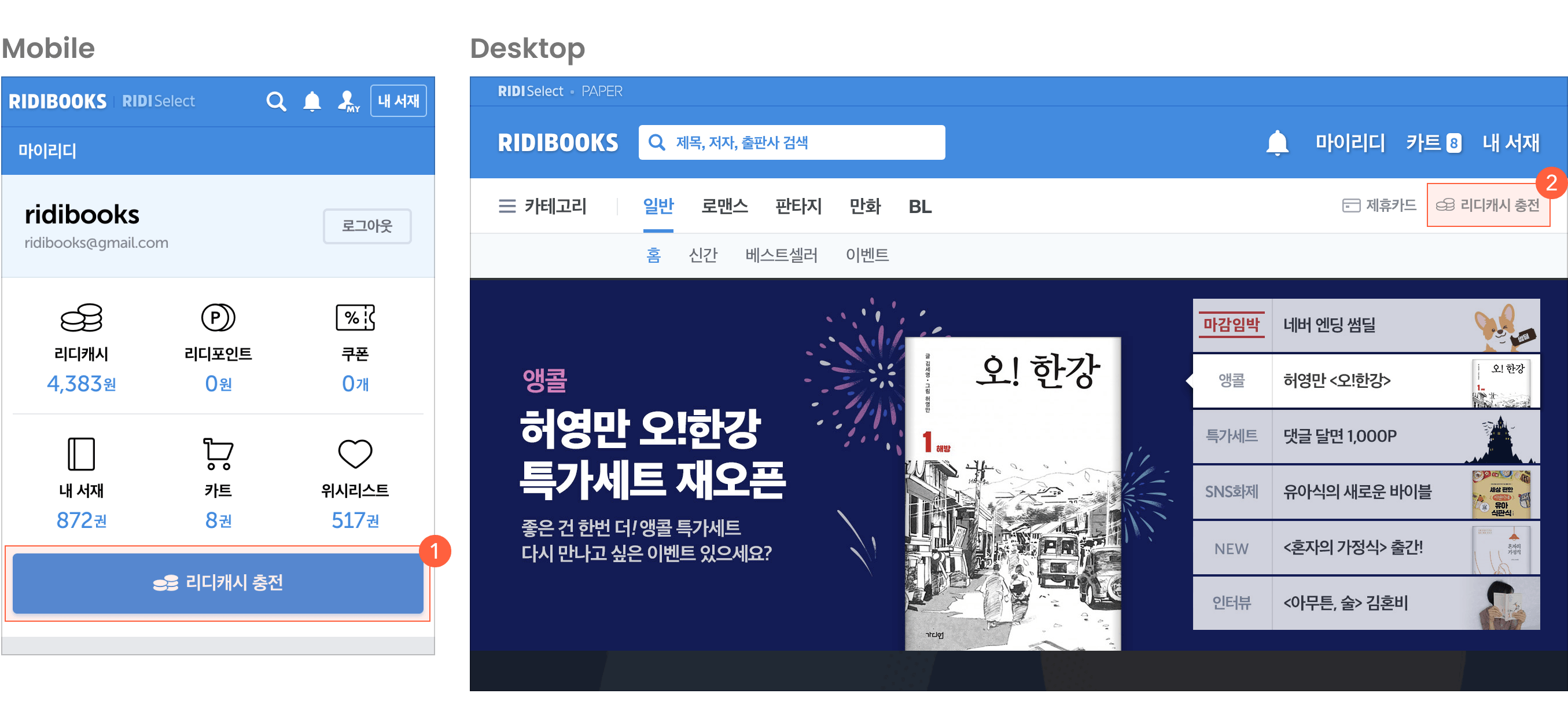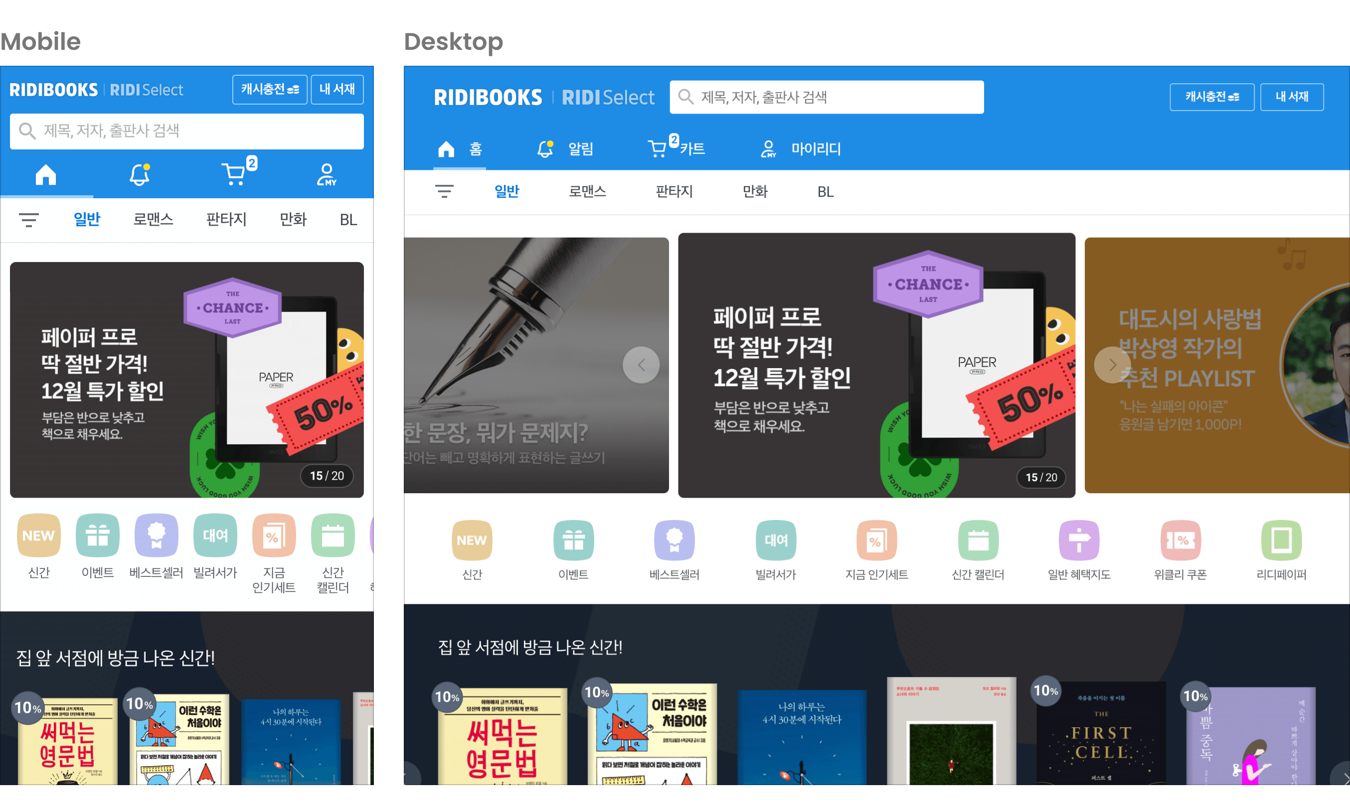 모바일, 데스크톱 나뉘어 있는 적응형 웹을 반응형 웹으로 바꾸면서 모바일, 데스크톱 최대한 구조를 통일하였습니다. 이제 리디캐시 충전 버튼은 모바일과 데스크톱에서 같은 위치에 존재합니다. 모바일과 데스크톱의 구조를 맞추면서 알림, 카트, 마이리디 같이 중요한 기능을 메인 탭으로 구성하여 모바일에서 해당 메뉴들의 접근성이 더 좋아졌습니다.