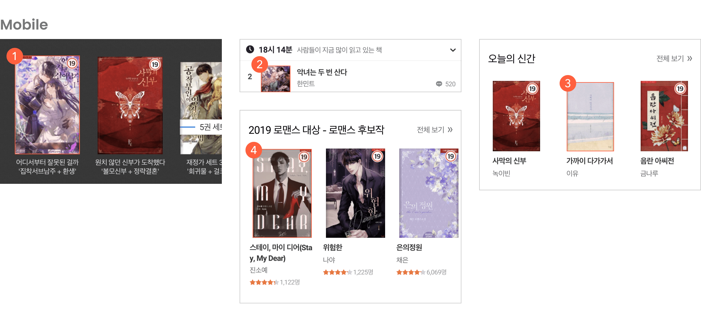 두 섹션 각각 모바일과 데스크톱 형태도 많이 다른 형태로 되어 있었습니다. 특히 베스트셀러는 중요한 영역임에도 불구하고 모바일에서는 3위까지만 노출되고 있었습니다. 당연히 데스크톱이 더 넓기 때문에 더 많은 순위를 보여줄 수 있는 게 당연합니다. 하지만 모바일에서도 높이를 많이 차지하지 않으면서도 더 많은 순위를 노출할 수 있는 패턴이 있음에도 불구하고 그렇게 구성되어 있지 않았습니다.