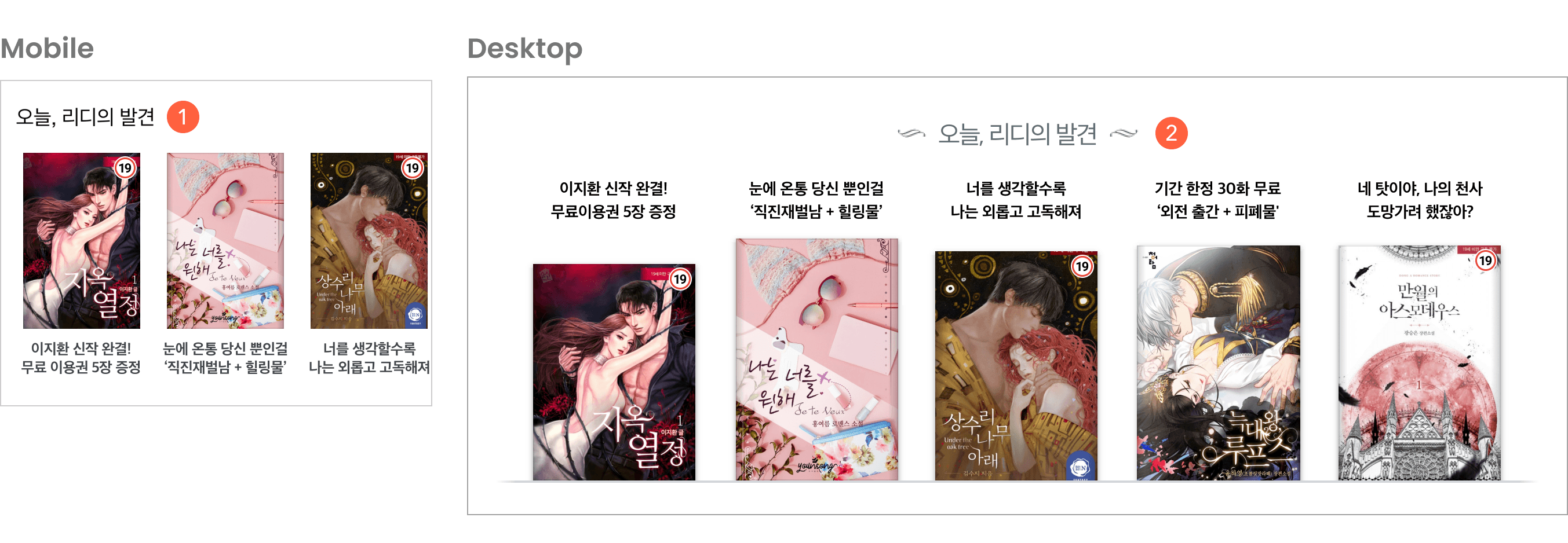 노출하는 책의 권 수가 다른 경우도 있었습니다. 데스크톱 ‘오늘, 리디의 발견’이라는 섹션 같은 경우, 5권의 책만 고정하여 노출했고, 모바일에서는 캐러셀을 사용하여 최대 20권까지 노출하고 있었습니다.
